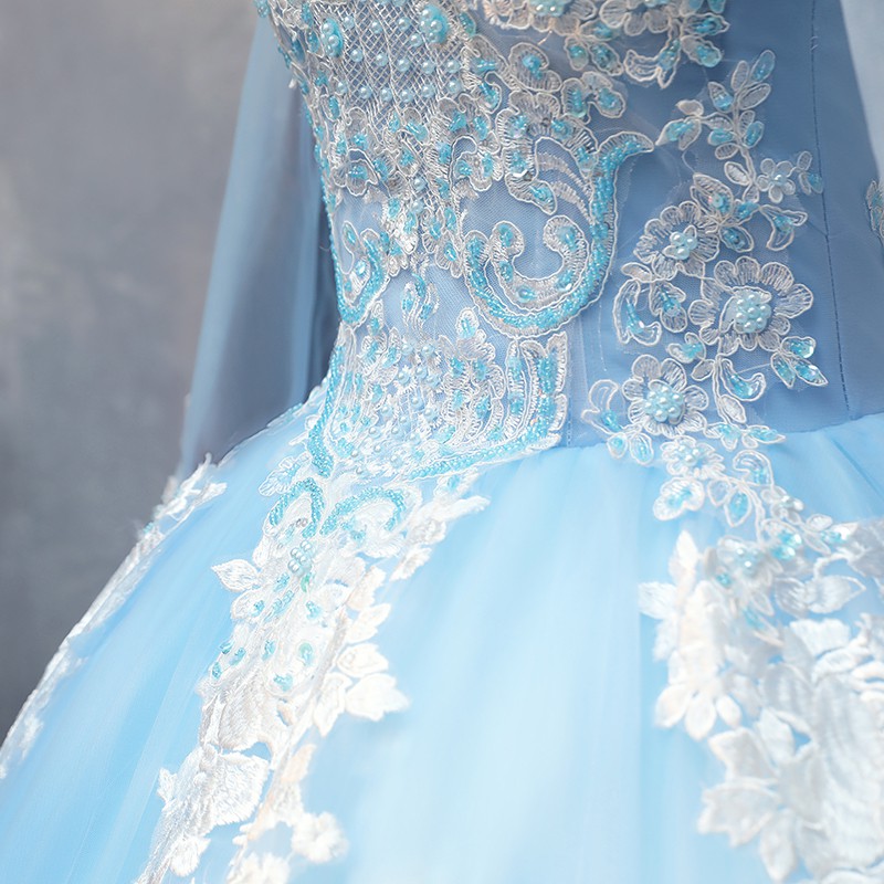 Beli wedding dress baju pengantin import gaun pengantin baby blue cantik. ✓ pengiriman cepat ✓ pembayaran 100% aman. Include mangset dan longtorso serta slyer veil kerudung, pashmina glitter dan daleman tille , ga nego . Gaun pengantin baby blue barbie .